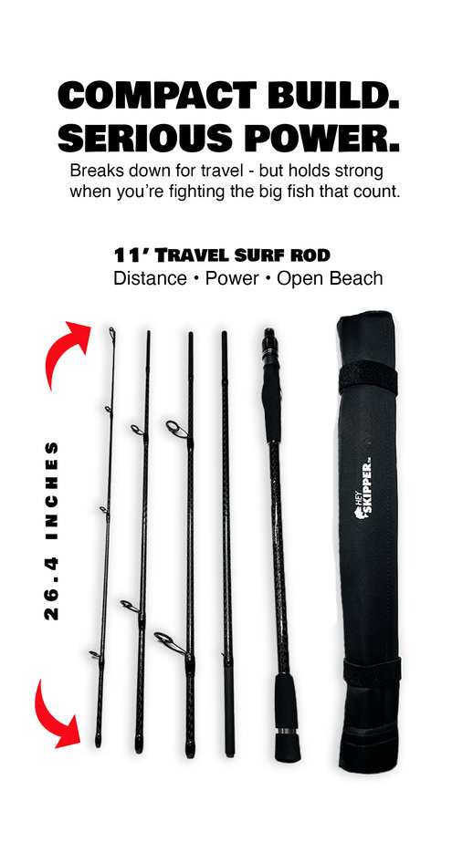 The 11′ Surf Travel Rod is built for anglers who want to cast far and cover more water. It’s perfect for targeting fish that hold beyond the first trough — from pompano and stripers to drum and sharks.