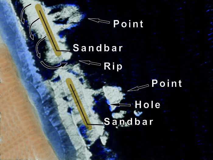 Structure: Look for sandbars, troughs, and cuts – these are where most of the fish will be hunting for food!