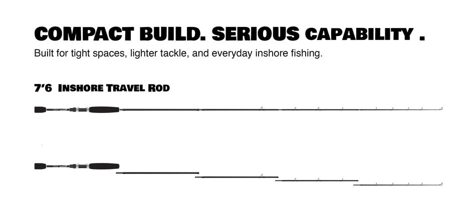 The Inshore Travel Rod (7’6”) is built for anglers who need finesse and precision. Its shorter length makes it ideal for working lures around docks, mangroves, bridges, and other tight spots where accuracy and sensitivity are key. Lightweight and easy to cast all day, it’s the perfect choice when you want to feel every subtle bite and outsmart fish up close.